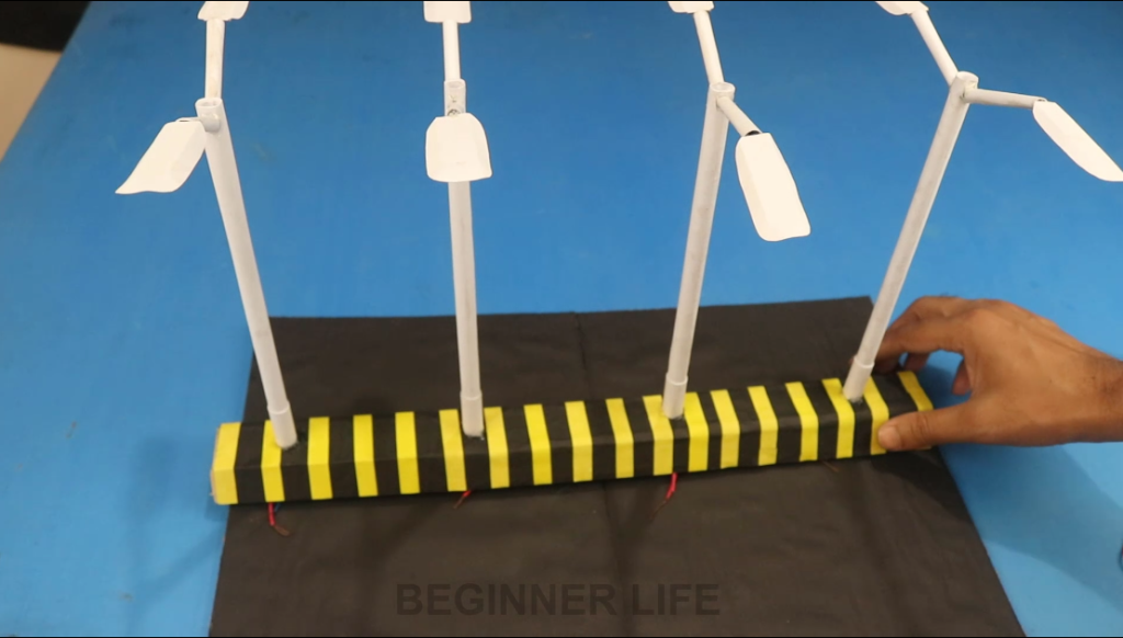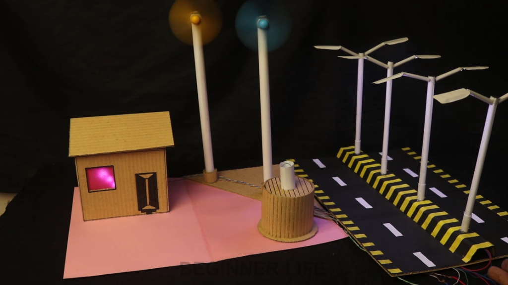 5. Connect the battery to the fan. When the fan rotates, the house lights and street lights will turn on.