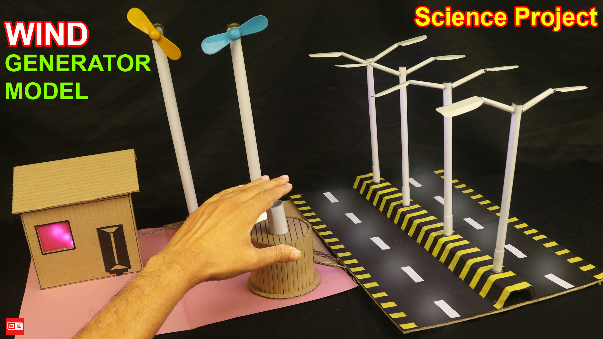 5. Connect the battery to the fan. When the fan rotates, the house lights and street lights will turn on.